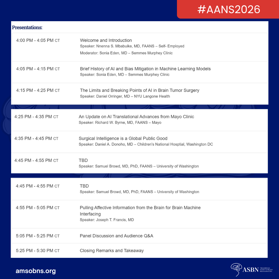 AANS/ASBN Presents: The Translational Future of AI in Neurosurgery Saturday, May 2, 2026 4:00 PM 5:30 PM Google Calendar ICS